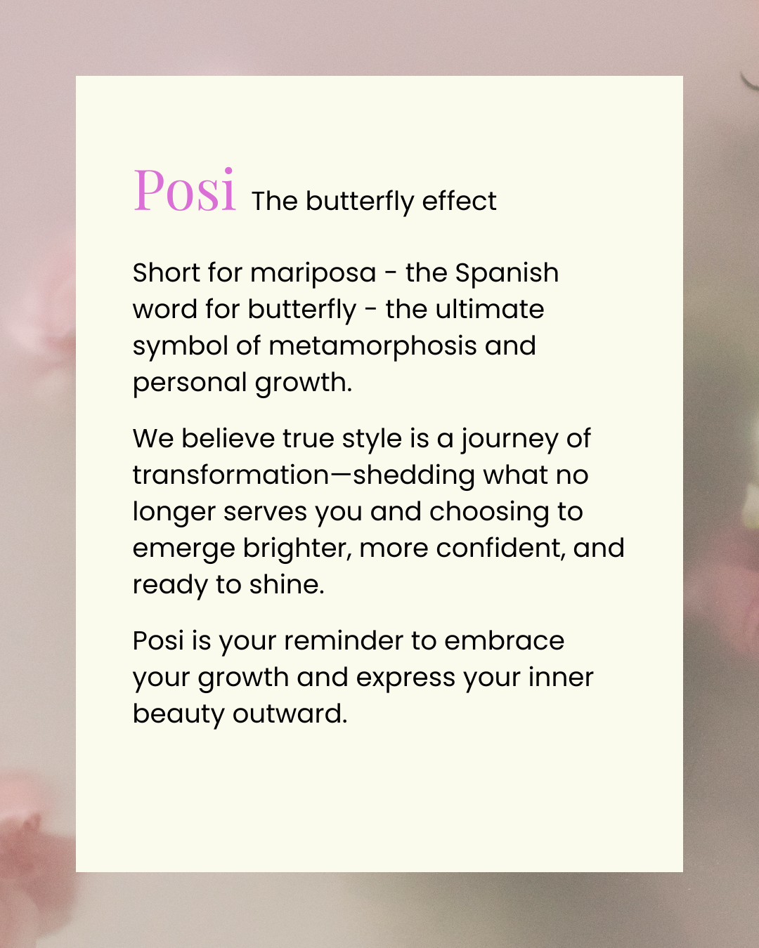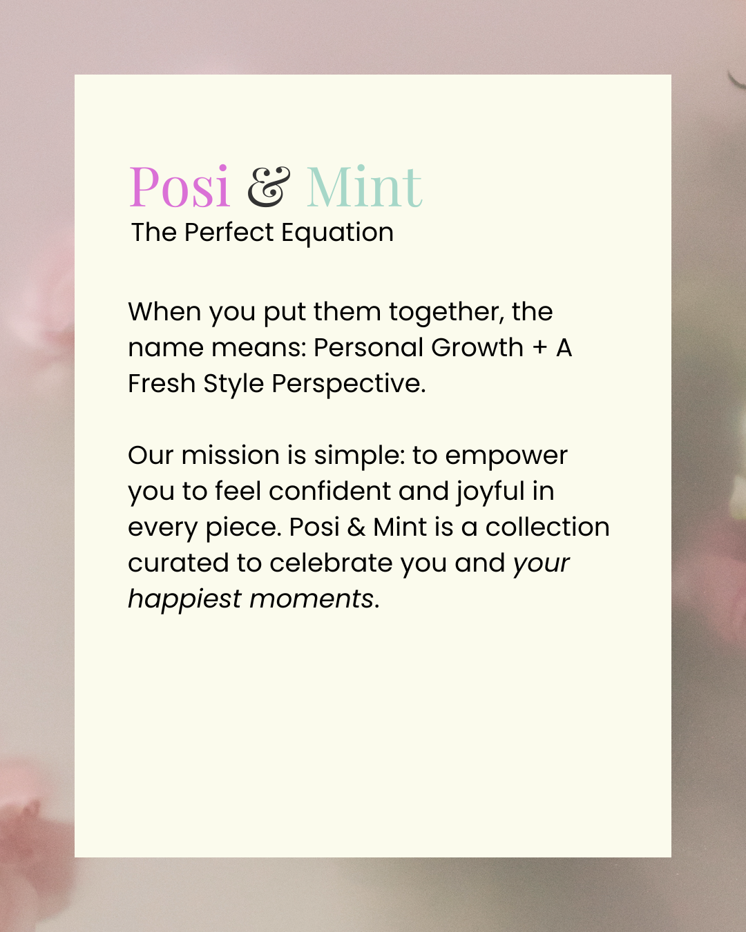 At Posi & Mint, our mission is built right into our name, which is a celebration of personal evolution and the joy found in self-expression. "Posi" is inspired by Mariposa, the Spanish word for butterfly, symbolizing transformation, growth, and inner beauty. Every butterfly starts as something else before achieving its full, brilliant potential—a beautiful reminder that transformation is natural and should be embraced. Paired with this is "Mint," representing a refreshing, new twist—the crisp, clean moment where you step into your transformed self with confidence and clarity. Posi & Mint is simply the promise of bringing a refreshing twist to your personal transformation journey.