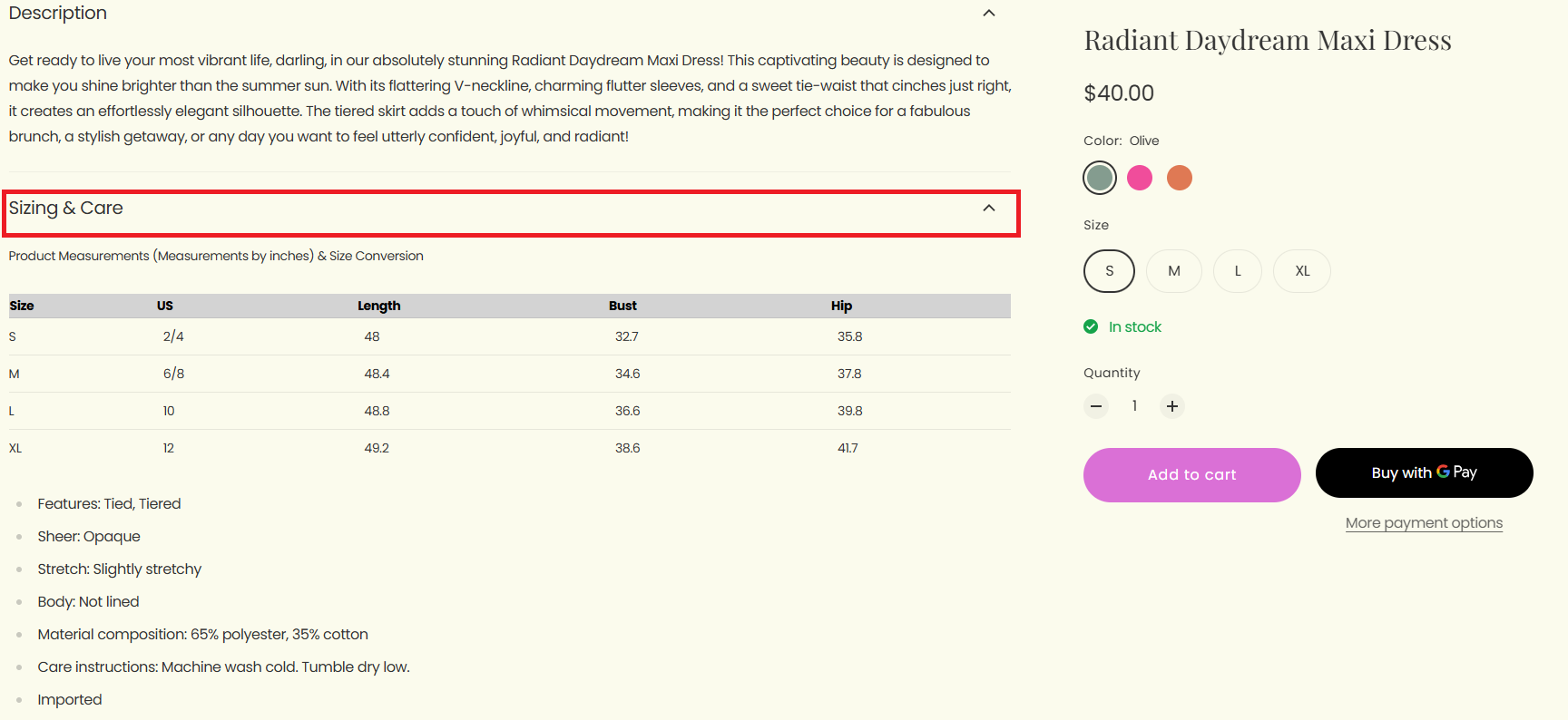 Because we have a curated collection from a variety of wonderful suppliers, sizing can sometimes vary. We want to make sure you find the perfect fit the first time, so each product page has a Sizing & Measurements dropdown. We highly recommend checking it out before you add to cart! It also includes all the details on the fabric and how to care for your new darling piece.
